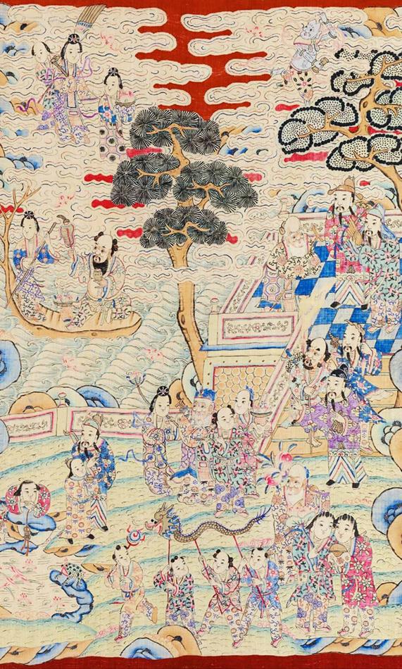 中国古代的神话传说和文学典故也深受福寿文化的影响,如“南极寿星”“麻姑献寿”“八仙祝寿”“蟠桃赴会”等都是家喻户晓的神话传说。甲骨文中“寿”字为“龟”的样子,曹操有诗曰:“神龟虽寿,犹有竟时……养怡之福,可得永年。”以此盛赞龟为长寿福瑞之物。金文中“寿”字傍边一个口表示酒杯,《诗经·幽风》云:“八月剥枣,十月获稻。为此春酒,以介眉寿……朋酒斯飨,曰杀羔羊。跻彼公堂,称彼兕觥,万寿无疆。”可见,献酒与祝寿有关。《诗经·小雅》的末章:“如月之恒,如日之升。如南山之寿,不骞不崩。如松柏之茂,无不尔或承。”描述的是一种祝颂长寿和祈佑幸福平安的形象。在中国古代福寿文化中,以梅、桃、菊、松、柏、鹤、绶带、锦鸡等象征长寿和福瑞吉祥,以寿物崇拜,以柏谐百,以竹谐祝,以鹤谐贺创作的“千寿图”“百寿图”“祝寿图”“贺寿图”,寓意着健康、长寿、幸福。在中国民间,千百年来被推崇具有长生不老神奇本领的各路神仙、吉祥物像,构成了中国人祈福求祥、盼望自己寿运长久的一幅美丽神奇的景观。