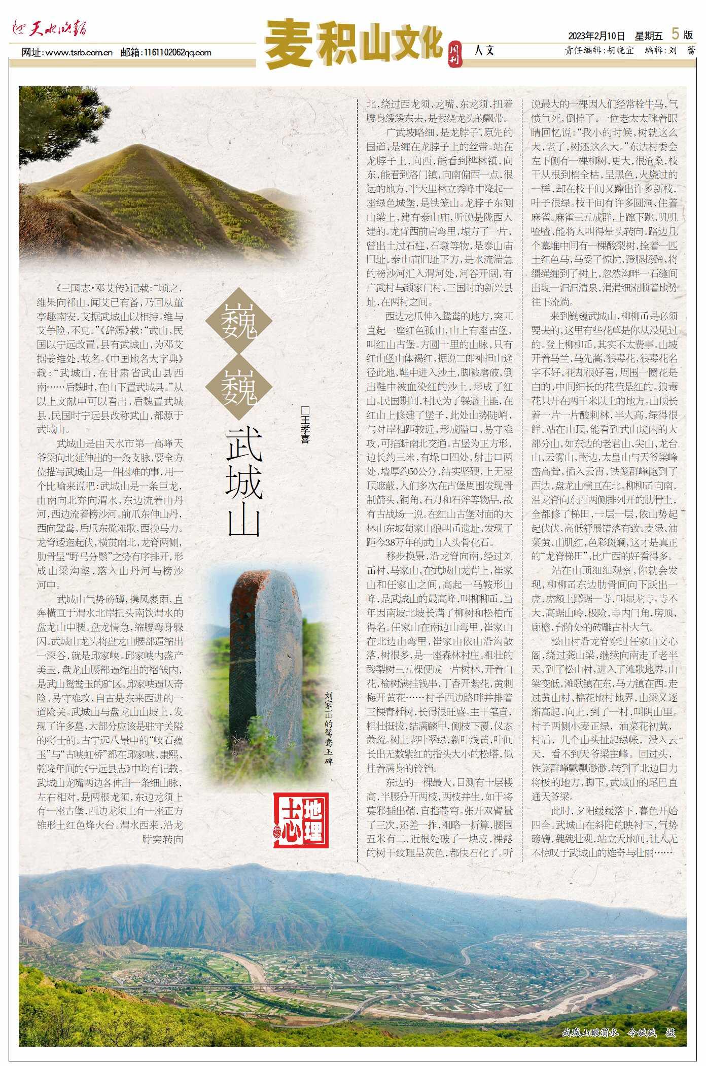 《三国志·邓艾传》记载:“顷之,维果向祁山,闻艾已有备,乃回从董亭趣南安,艾据武城山以相持。维与艾争险,不克。”《辞源》载:“武山,民国以宁远改置,县有武城山,为邓艾据姜维处,故名。《中国地名大字典》载:“武城山,在甘肃省武山县西南……后魏时,在山下置武城县。”从以上文献中可以看出,后魏置武城县,民国时宁远县改称武山,都源于武城山。