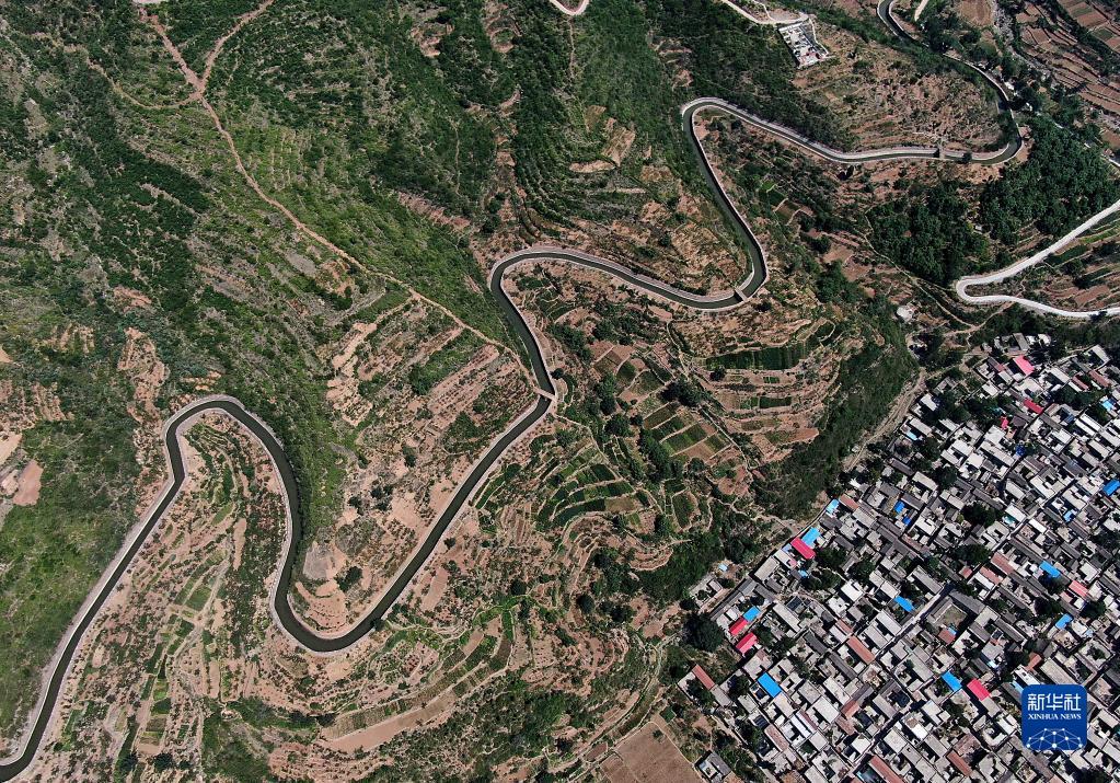青山环抱的陕西省延安市延川县文安驿镇梁家河村(2019年8月12日摄,无人机照片)。新华社记者 陶明 摄