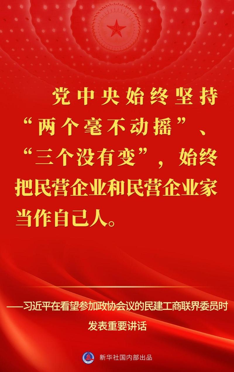 “党中央始终坚持‘两个毫不动摇’、‘三个没有变’,始终把民营企业和民营企业家当作自己人。”3月6日,习近平总书记在看望参加全国政协十四届一次会议的民建、工商联界委员并参加联组会时发表重要讲话,强调要引导民营企业和民营企业家正确理解党中央方针政策,增强信心、轻装上阵、大胆发展。
