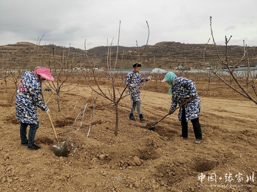 3月28日,记者走进位于张家川镇刘家村的张家川县现代果业产业园,在室外培育基地,果农们手握铁锹,在一棵棵樱桃树前围堰培土浇水拉枝整形。