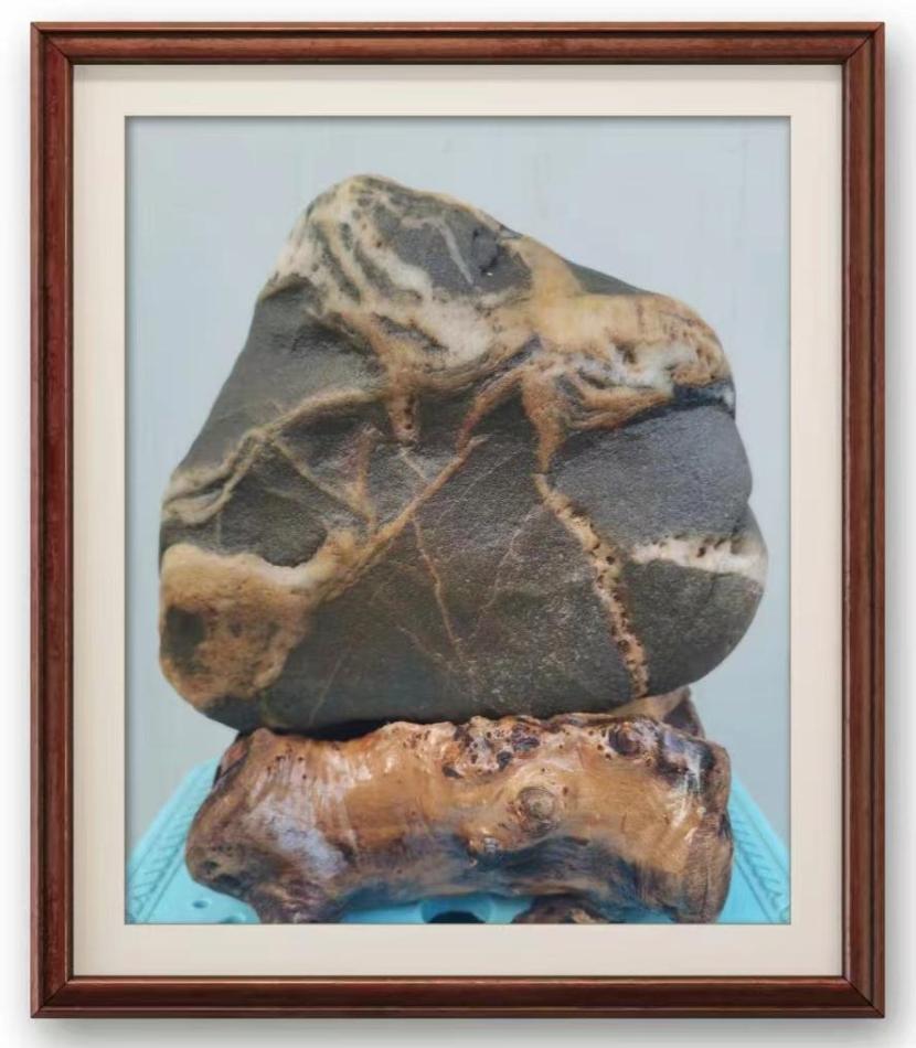 先生喜石,深得石趣。自称“五百石奴仆”,闲暇时约三五石友,每至深山大沟、渭河滩头,搜捡奇石,颇得觅石之乐。偶遇意中石,如获至宝,欣喜若狂,远观近瞅,左顾右盼,又得赏石之乐。辟大屋以供石,灵石满屋,气象万千,或对石赋诗,或抚石咏唱,再得题石之乐。于先生,石中有诗、有联、有书法、有人生。