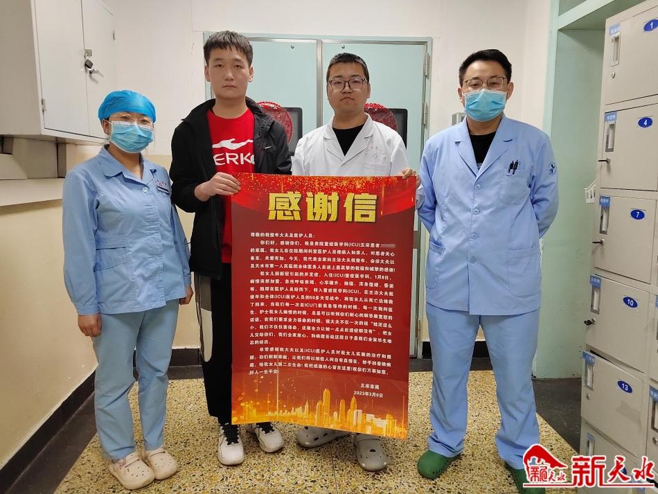 近日,ICU医护人员再次收到了一位患者家属送来的大红纸感谢信。原来,这位女患者1月份因新冠引起并发症,心率骤升、抽搐、浑身僵硬,昏迷不醒,到医院诊治时视病情被转入重症医学科救治。进入ICU病房时,患者癫痫状态持续,急性呼吸衰竭,神志浅昏迷,呼吸急促颜面发绀。医护人员先后采取各种措施进行抢救治疗,并行气管切开术。术后不断优化诊疗方案,护理团队寸步不离与病魔抗争。经过一段时间的救治,患者病情日趋稳定,各项监测指标好转,3月6日起停用有创呼吸机,使用气切套管内吸氧,3月底顺利出院。其家属在信中满怀感激地说,爱女进入ICU后,医护人员视病人如亲人,对患者关心备至,经过50多天的苦战,将她从死亡线上救了回来,是ICU的医生和护士给了爱女第二次生命,挽救了他们一个完整的家,他们非常感谢医护们高超的医术和精心的护理。