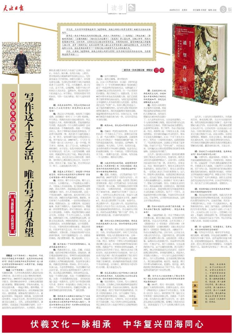 不久前,天水青年作家杨逍新书《遥望西域:丝路上的骑士风骨与背影》由重庆出版社出版发行。
