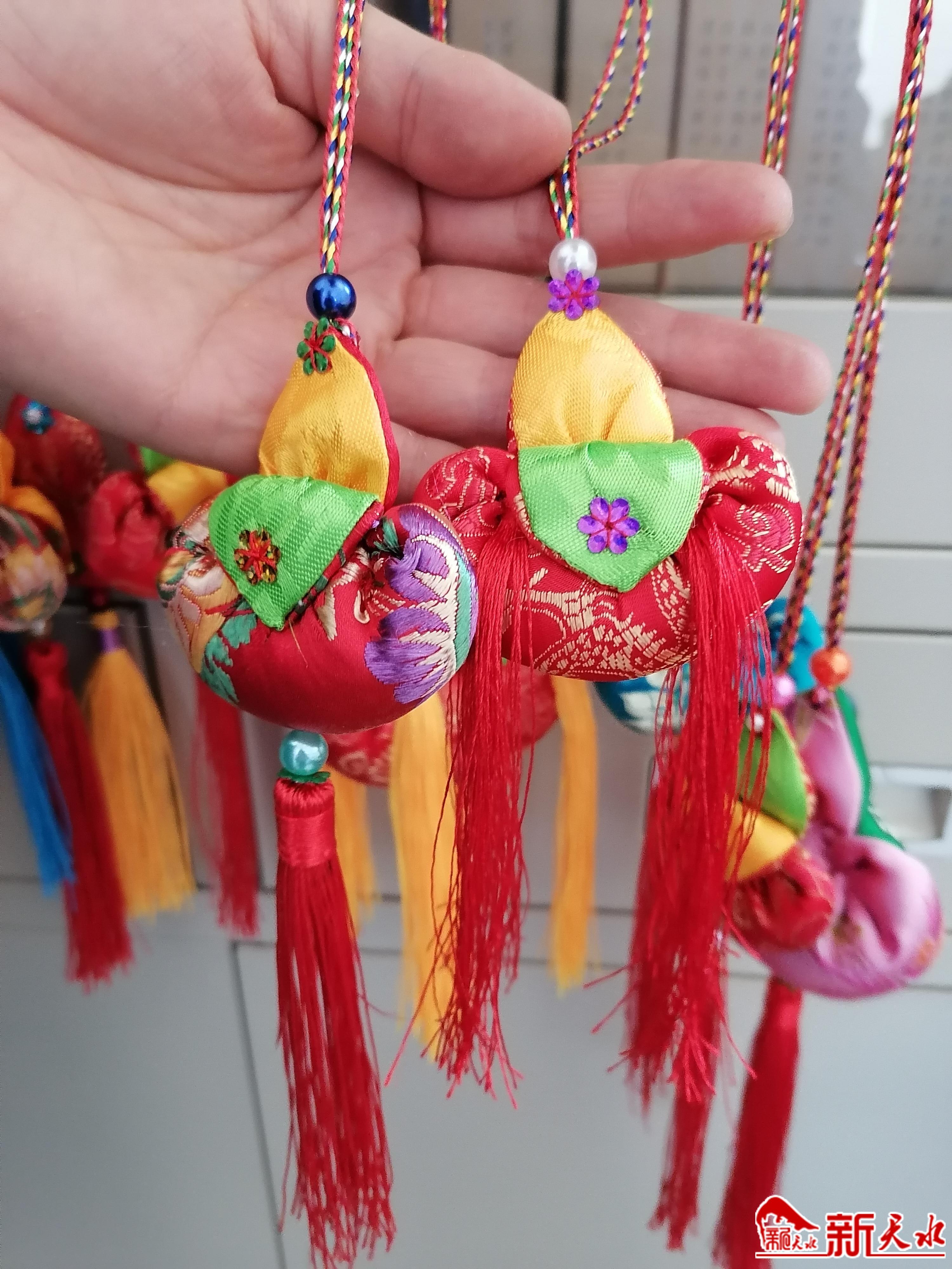 七十岁的曹菊叶说,她小的时候,只看大人做荷包。以后啊,生活窘迫,自己也没学做荷包。前些年,生活好了,可她的孙子也没有荷包可佩戴。现在呀,我学做荷包,给孙子带,给大家带。她的眼睛透过还贴着度数标签的老花镜,喜悦纷飞。她说,平时在家,一天看手机,看得眼前都是黑疙瘩。现在,眼前一片明亮。