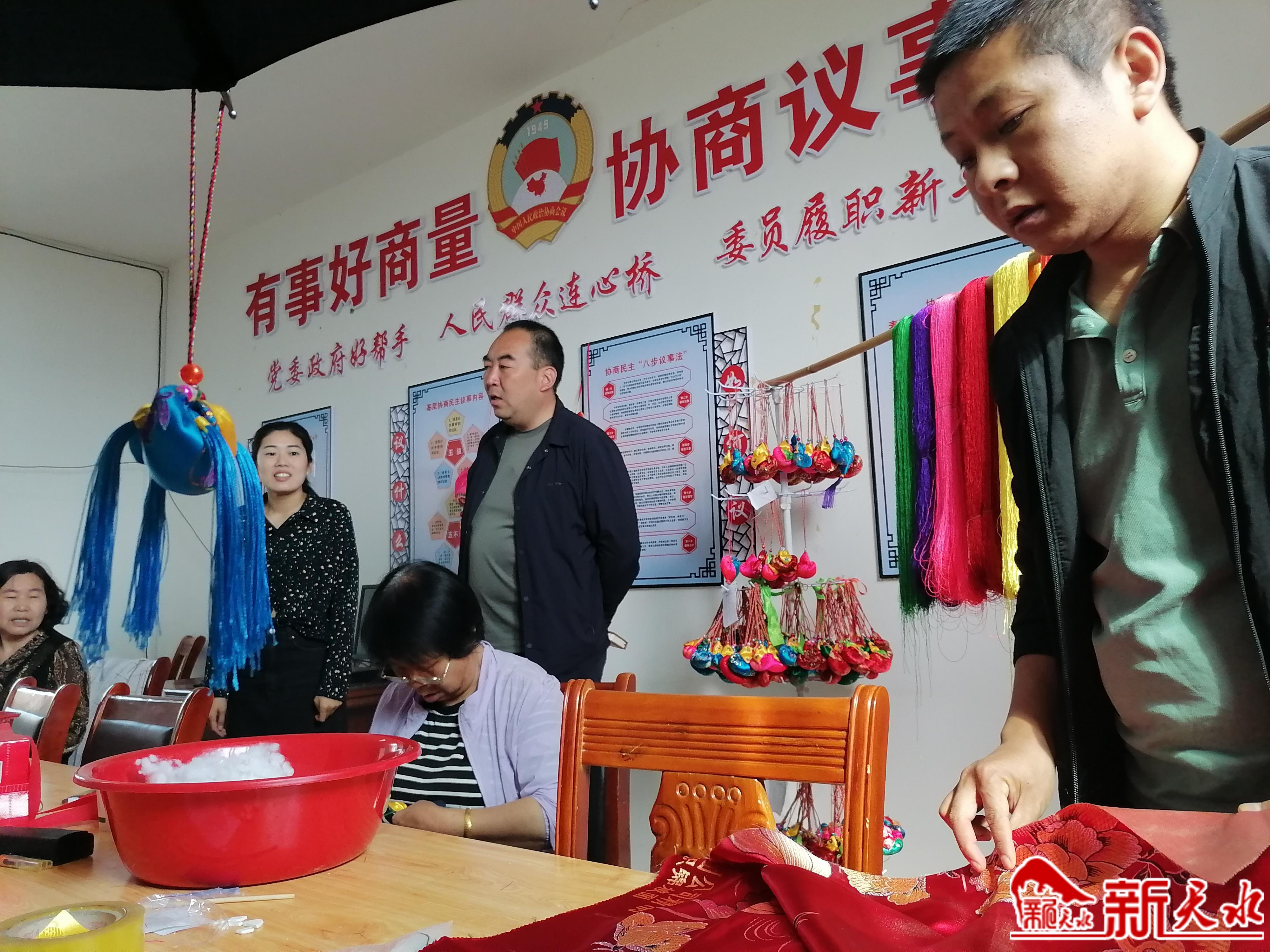 再动员在家的妇女。平时很少做手工的缑自兰来了,从西安回来的赵引粉来了,刘小菊又在办公室踏起了飞人牌缝纫机。曹菊叶戴着老花镜来了。九零后的村文书,也要学做绣荷包。