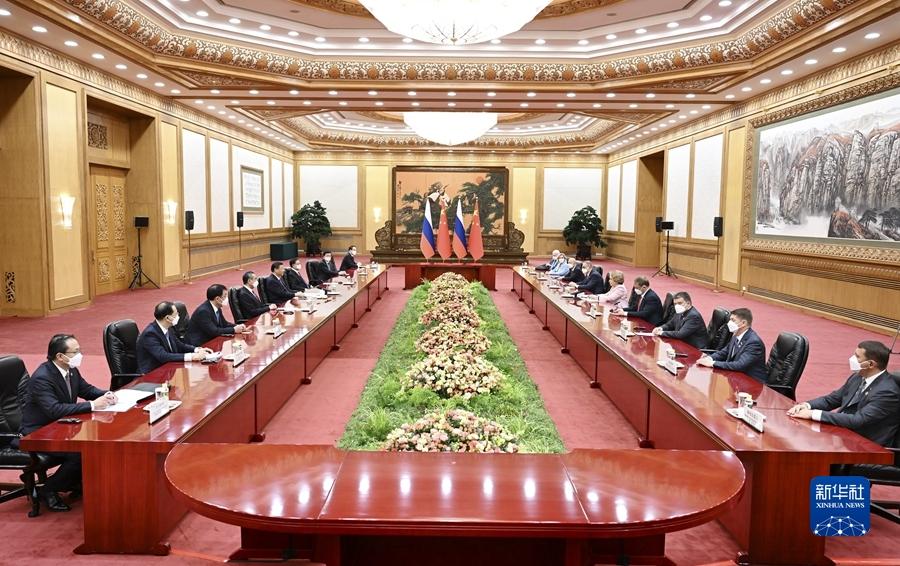 习近平指出,在双方共同努力下,中俄关系始终保持健康稳定发展势头,各领域合作稳步推进,两国世代友好的社会基础和民意基础更加牢固。今年3月,我对俄罗斯进行国事访问,同普京总统就深化两国全面战略协作和各领域务实合作达成新的重要共识。发展中俄关系是两国基于各自国家和人民根本利益作出的战略选择。中方愿继续同俄方一道,发展守望相助、深度融通、开拓创新、普惠共赢的新时代全面战略协作伙伴关系,助力两国发展振兴,推动建设繁荣稳定、公平公正的世界。