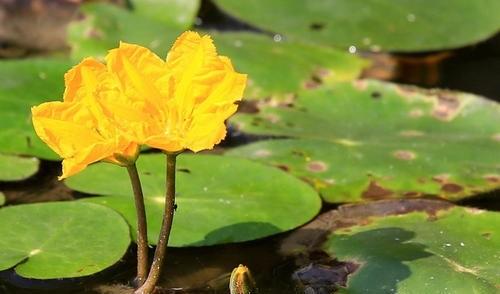 水荷叶和马蹄菜是两种长相极其相似的水生植物,要是对它们不怎么熟悉的人,光凭肉眼还真难以区分,它们都长了椭圆的叶片,大小形状也差不多,只是水荷叶的叶片与马蹄菜比起来,稍稍有些尖而已,但这个尖也必须是你在把它们俩放到一起比较后才得知的,单个来看,你还是不容易分辨出哪个是水荷叶,哪个是马蹄菜。容易分辨的是它们的花,水荷叶开黄色的花,色彩艳丽,而马蹄菜的花则是暗红色的。如果你肯下手,那也好区分它们,马蹄菜的茎和叶背都有透明的黏液附着,摸到手上黏滋滋的,有滑溜溜的感觉,而水荷叶的茎和叶上却没有这些,摸到手里的感觉跟其他的水草比如荷叶、菱等没多大的区别。