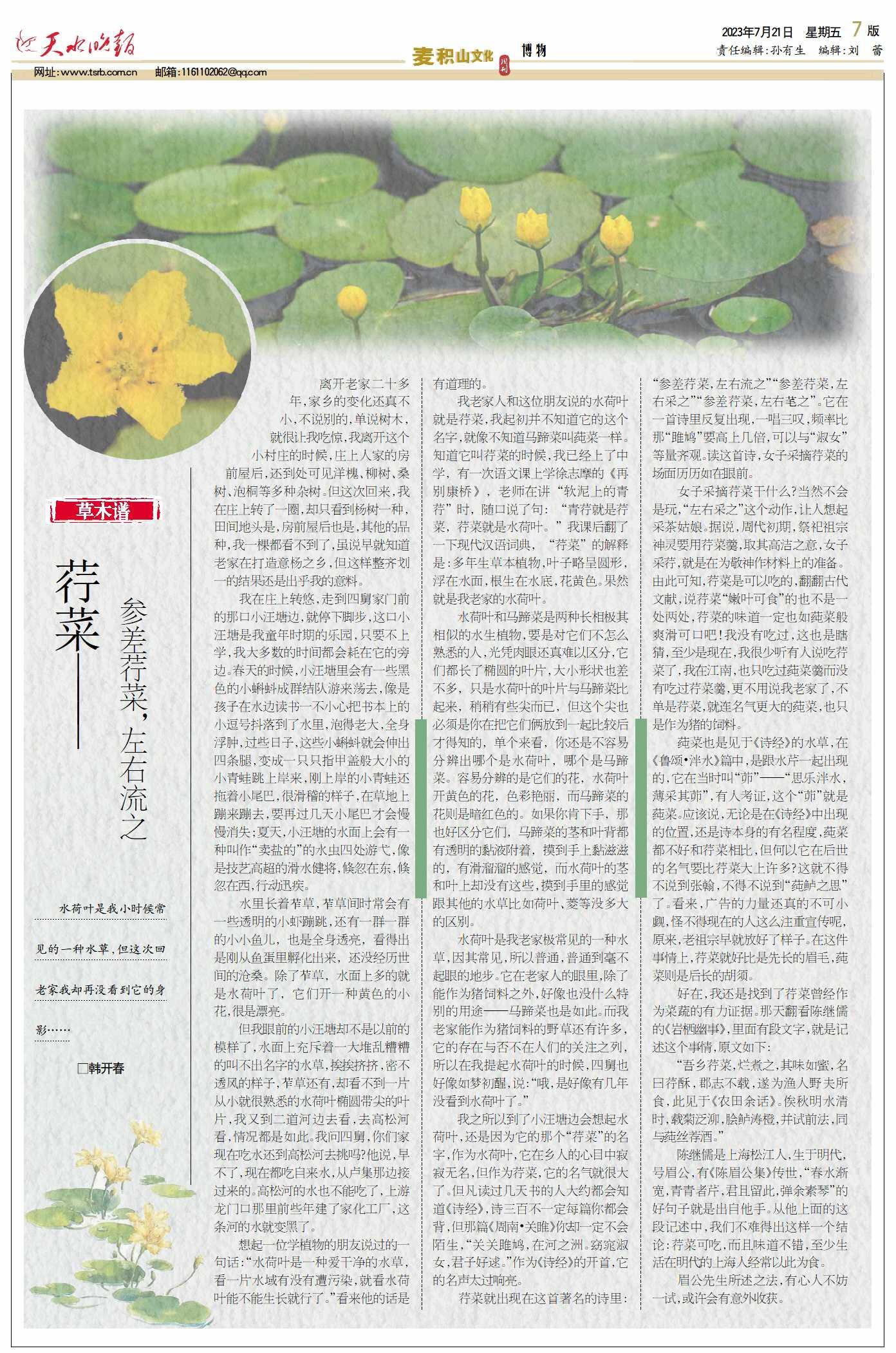荇菜就出现在这首著名的诗里:“参差荇菜,左右流之”“参差荇菜,左右采之”“参差荇菜,左右芼之”。它在一首诗里反复出现,一唱三叹,频率比那“雎鸠”要高上几倍,可以与“淑女”等量齐观。读这首诗,女子采摘荇菜的场面历历如在眼前。