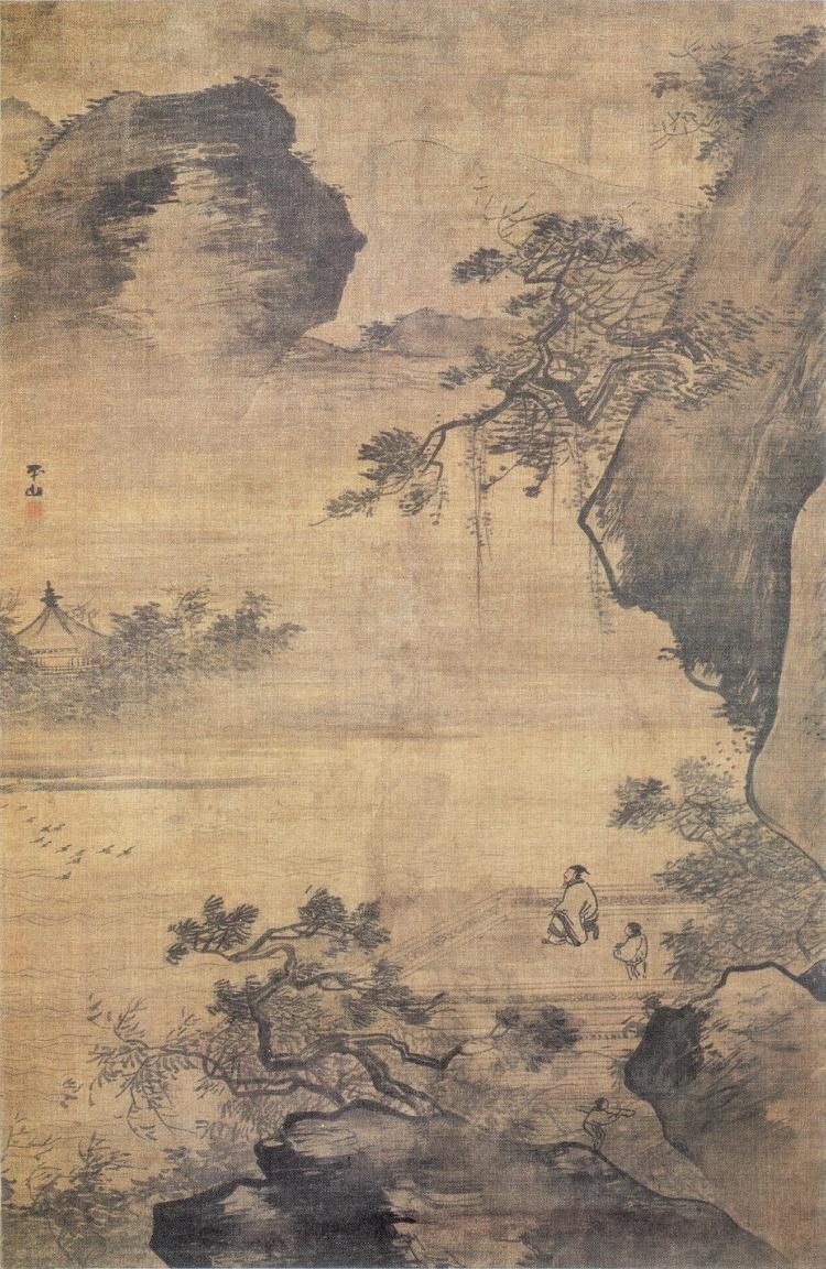 几块巨石形成的悬崖之上,有老树藤萝缠绕错布,迎风而摇曳多姿。悬崖下有石砌高台一个,四周栏杆相围。高台中央有一长者,端坐小凳之上,正在观看江上逐浪而飞的一群大雁,身边有一伫立的童子伺候。台下的石阶上,一童子抱琴正在拾级而上,他可不能误了主人的雅兴。江上云雾迷蒙,对岸有树丛掩映的亭台一座,其后是若隐若现的近峦远山……