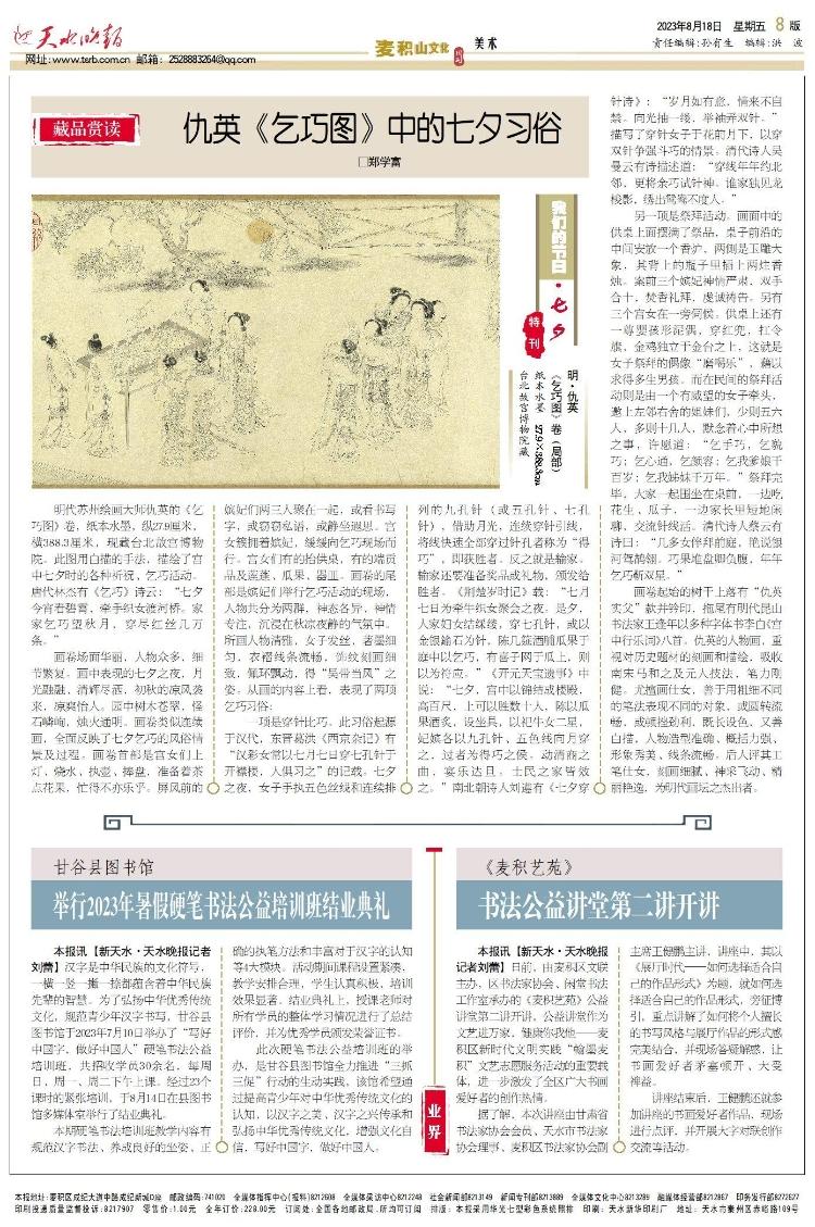 明代苏州绘画大师仇英的《乞巧图》卷,纸本水墨,纵27.9厘米,横388.3厘米,现藏台北故宫博物院。此图用白描的手法,描绘了宫中七夕时的各种祈祝、乞巧活动。唐代林杰有《乞巧》诗云:“七夕今宵看碧霄,牵手织女渡河桥。家家乞巧望秋月,穿尽红丝几万条。”