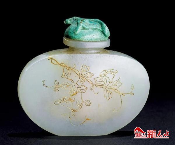 清乾隆白玉御题诗文牵牛花烟壶(图三),宽6厘米,白玉质,莹润有光泽。器型为扁瓶型,敞口,短束颈,丰肩,弧腹下收,平底,造型朴素典雅。上承绿松石螭纹钮,连牙质匙,手可盈握。外壁正面巧用沁色,阴刻线勾画牵牛花一束,花枝自右上角垂下,枝叶纤细,摇曳生姿。枝头繁花疏密得宜,刀法概略至极,意蕴古淡天真。反面阴刻隶书御题牵牛诗:“河畔黄姑不耐单,服箱空望露华溥,连延蔓引枫枝上,抱树秋蝉为唱寒。”诗文字迹端庄秀美,摘自《御制诗三集卷》五十七《牵牛》(作于1766年)。此器用料考究,玉质细腻温润,造型虽简,但趣意盎然、线条有力、刀工洗练、布局疏朗、气质优雅、诗画相宜,代表了宫廷造办处工匠的非凡技艺。