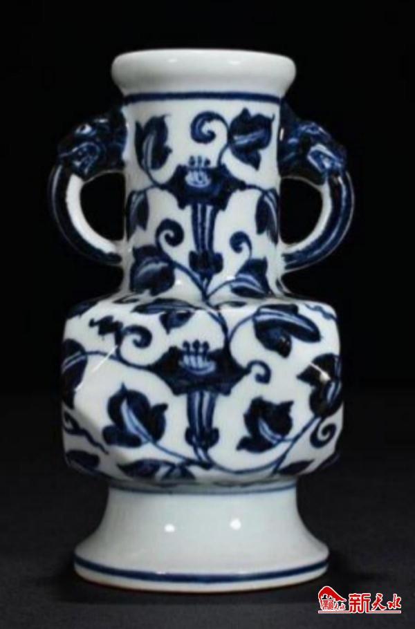 明宣德青花缠枝牵牛花纹倭角尊(图一),藏于北京故宫博物院,高14厘米,其形隽巧可爱,独特新奇,唇口直颈,颈上附饰铺首双耳,倭角式方腹,圈足外撇。通体以青花绘饰牵牛花六朵,均以花朵正面形态为主题,茎蔓缠绕,疏密得当。青花亮丽深沉之色,让人感到宣青的苍健与雄浑,釉色妍亮泛青,气泡密集,大小不一,显云雾状,在湛蓝色的钴料映衬之下犹如星空般深邃。釉面所见淡黄色的纹片纵横,飘逸流畅,形成美妙的“金丝”,正是历经着数百年风霜之见证。底部处理为台阶式,内书“大明宣德年制”六字青花楷书款,笔力朴拙遒劲、古意盎然,无论其点之大小,划之长短,运笔之轻重,间架之疏密均彰显出明初大书法家沈度之风韵。