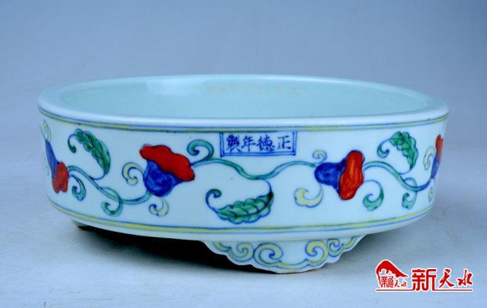 明正德斗彩缠枝牵牛花纹三足洗(图二),直径23厘米,该洗胎体厚重,壁厚达1厘米,敞口,直壁,腹下折收,承云头形三足。洗外壁饰斗彩缠枝牵牛花,以青花描绘纹饰,再填以黄、绿、红三色,形成绿蔓、绿叶,黄萼,红蓝花,将牵牛花色彩艳丽、五彩斑斓的特色,十分形象地绘制出来,清雅脱俗、美艳动人。三足绘黄色变形如意云头纹,外口沿下双方框内书“正德年制”四字楷书款,斗彩纹饰构图疏朗,具有成化斗彩的特色。正德流行不用红色的素三彩,斗彩也很少用红色,这个洗使用了红彩,十分罕见。