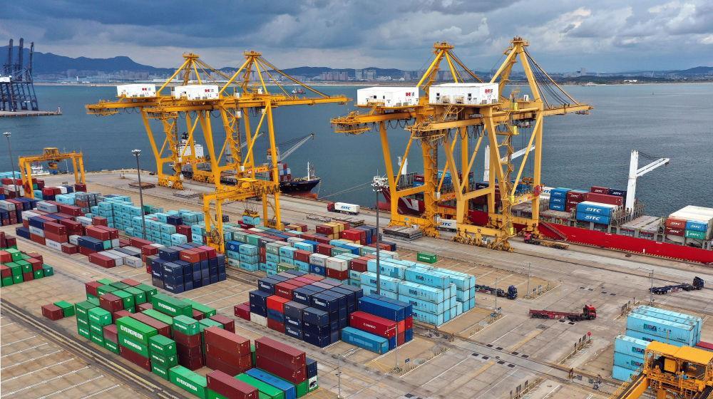 △在辽宁大连市辽宁港口集团大连港集装箱码头,货轮在装卸集装箱。