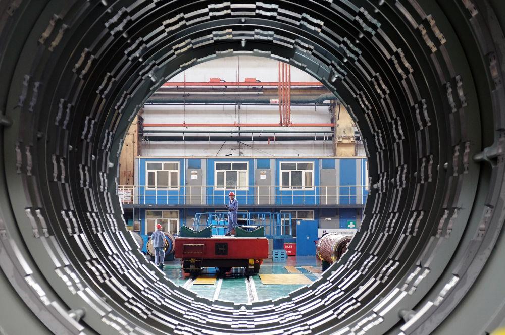 △2023年8月31日,工人在哈电集团哈尔滨电机厂有限责任公司的水电分厂重型车间作业。