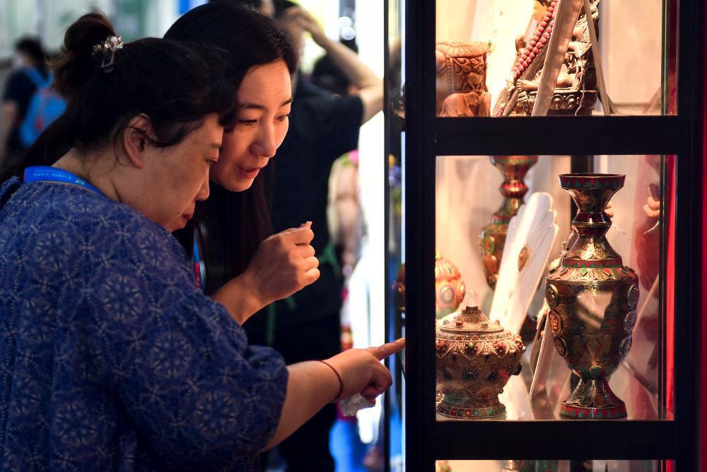 △2023年8月24日,参观者在第十四届中国—东北亚博览会现场选购尼泊尔特色商品。