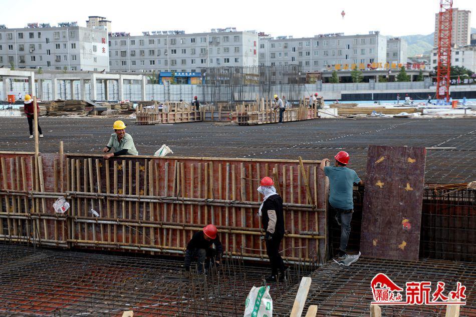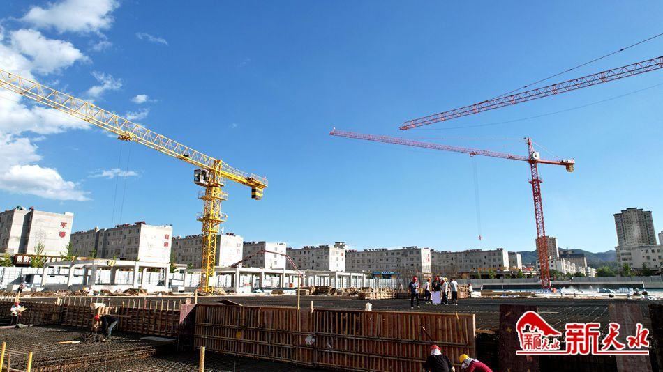 在清水县轩辕广场地下停车场、商业综合体及广场提升改造项目的现场,塔吊林立、钢筋交错,工人们穿梭其间进行封顶、防水、收拾材料等工作,一派热火朝天的建设景象。
