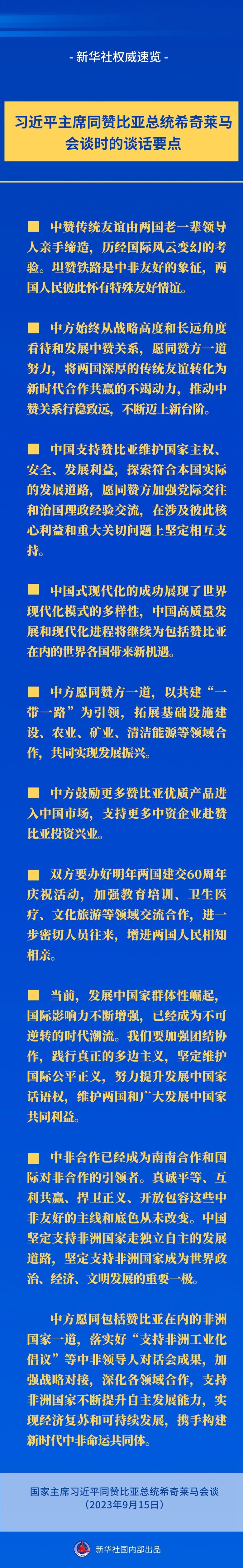 权威速览丨习近平主席同赞比亚总统希奇莱马会谈时的谈话要点