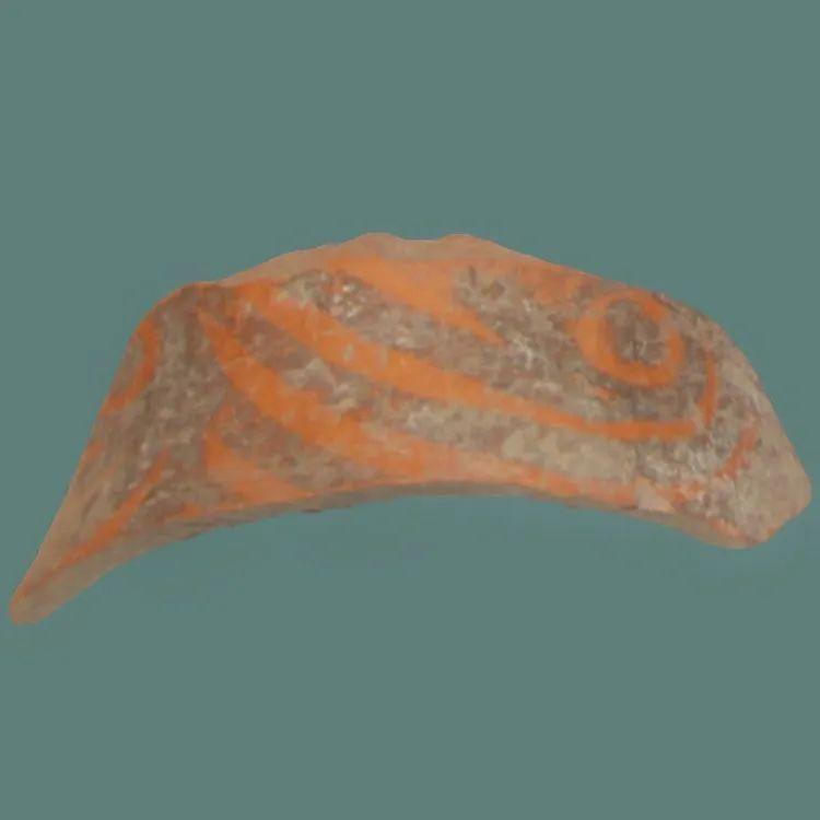 张家台子遗址出土石岭下文化彩陶片。细泥质橙黄陶,略呈弧状长方片,表面光滑,以黑彩绘弧线、弧线三角和圆圈带点纹,构成一变体鸟头纹图案。