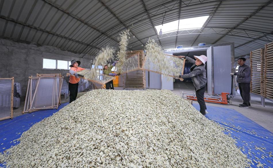 同时,建成了占地面积约3.5亩,包括仓库、烘干、包装、成品储藏等区域的加工车间。走进加工车间,可以看到工人们正在挑拣收购来的七月菊,然后层层堆放在货架上,准备进行烘干,已经烘干的正在进行装袋,准备销售。
