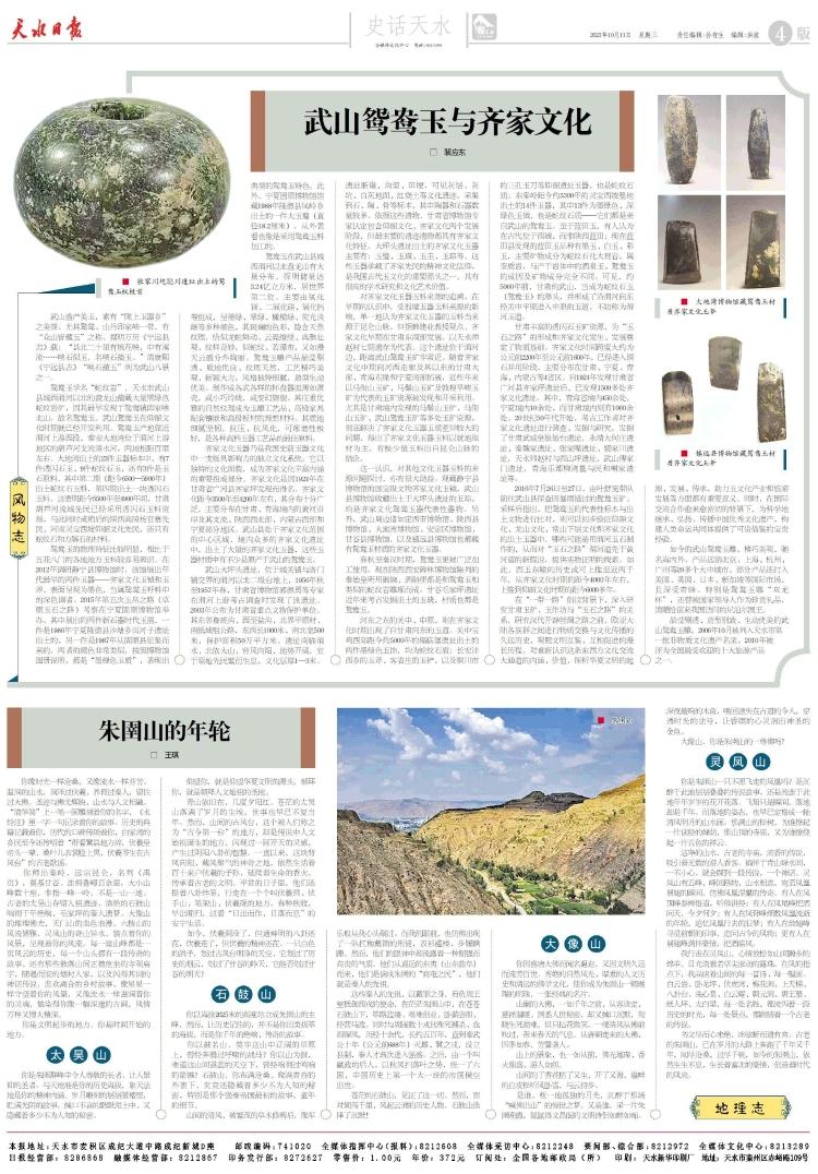 你师出秦岭,远宗昆仑,名列《禹贡》,奠基甘谷。连绵叠嶂百余里,大小山峰数十座,非指一峰一岭,不是一山一地。古老的太昊山存留人祖遗迹,清绝的石鼓山响彻千年绝响,毛家坪的秦人遗梦,大像山的璀璨佛光,天门山的血色浪漫,六棱山的风流儒雅,灵凤山的奇山异水,装点着你的风景,呈现着你的风流。每一座山峰都是一页风云的历史,每一个山头都有一段传奇的故事,还有那些散落山间正襟危坐的寺观庙宇,随遇而安的烟村人家,以及闪烁其词的神话传说,悲欢离合的乡村故事,像星星一样守望着你的风景,又像流水一样滋润着你的灵魂,皴染得你像一幅深邃的古画,风情万种又博大精深。