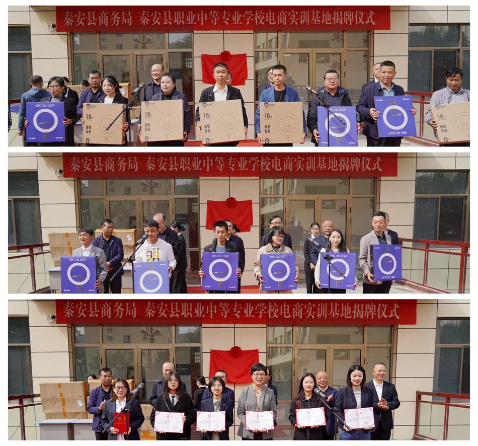 揭牌仪式上,为部分镇、县职教中心和网红发放了网络直播设备;为刘学颖、李文慧等6名教师颁发了电商顾问聘书;张天龙、张涛涛共同为秦安县商务局、秦安县职业中等专业学校电商实训基地揭牌。