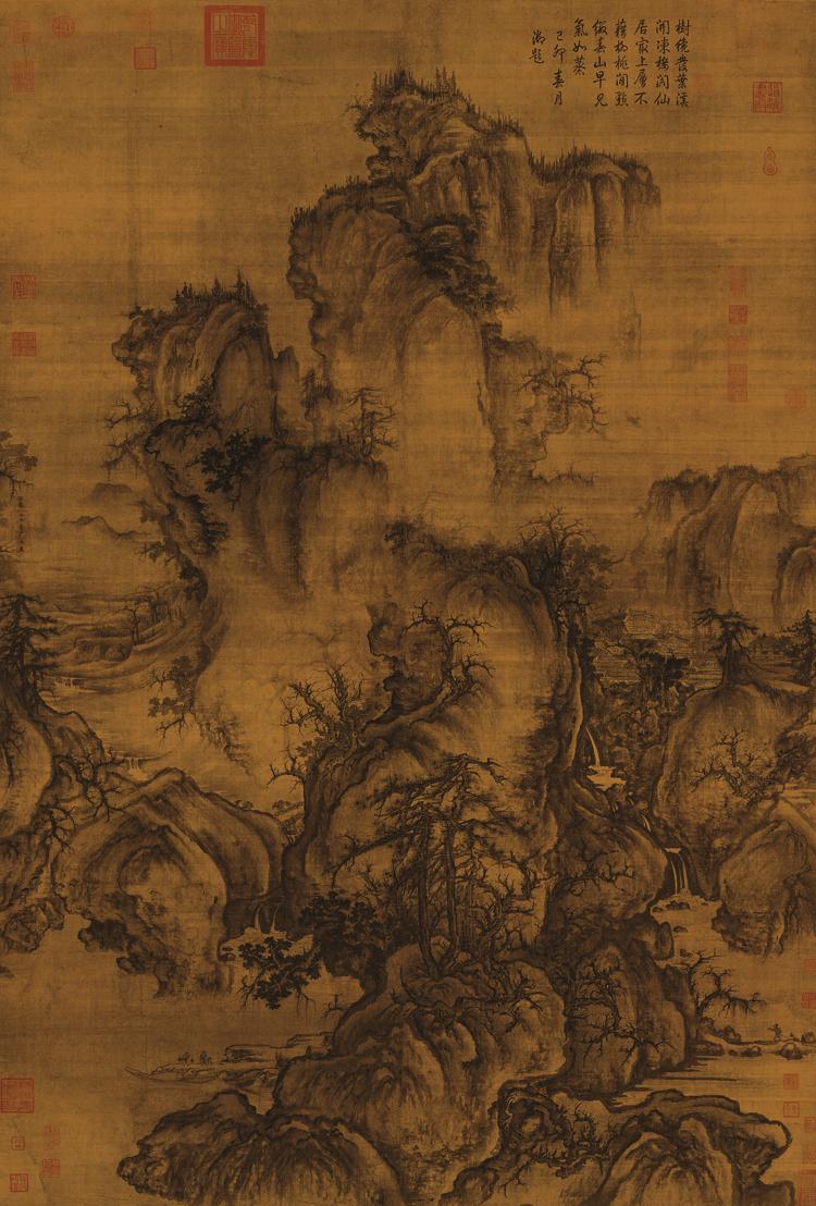 此图描写早春即将来临的山中景象。冬去春来,大地复苏,在水岸与山巅的淡雾烟岚间,露出了春的生机。远处山峰耸拔,气势雄伟;近处圆岗层叠,山石突兀;山间泉水淙淙而下,汇入河谷,桥路楼观掩映于山崖丛树间……