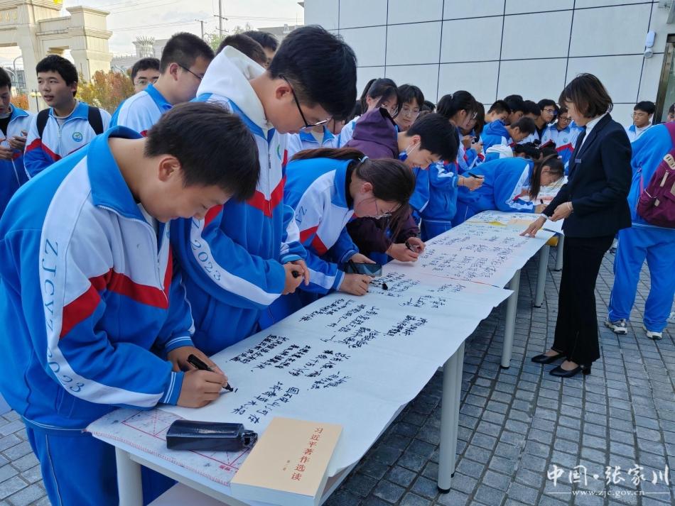新天水讯 据张家川县融媒体中心消息 笔墨挥洒不尽对党的真情,丹青承载不了对祖国的热爱。为弘扬中华民族优秀传统文化,提升广大青少年民族自豪感,培养爱国主义情怀。近日,张家川县科协联合县新时代文明实践中心在科技馆广场共同举办了“翰墨颂党恩 传承爱国情”爱国主义教育活动,活动现场通过百米长卷书写爱国诗词、讲述爱国故事等形式教育引导广大师生爱党爱国爱社会主义,张家川县第一中学高一年级10个班560余名师生参加活动。