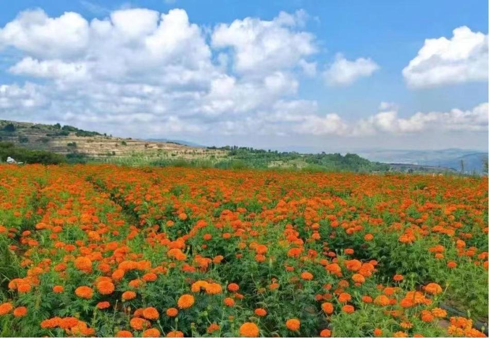 打造特色产业,找准“突破口”。聚焦特色优势产业发展,创新推行“党支部+基地+联合社+群众”的发展模式,大力发展万寿菊、蚕豆产业,在13村建设万寿菊育苗基地51亩,在14村种植万寿菊3800亩、蚕豆1.7万亩,实现收益238万元。在牛头河流域种植蔬菜1000亩,依托村级股份经济合作社发展特色大棚蔬菜(西红柿、辣椒、大蒜等)、黑白木耳、香菇、三色圣女果,特色食葵、苦荞以及金银花等中药材,着眼“七彩经济”,积极推广“黑”木耳、“金”玲珑、“红”辣椒、“褐”香菇、“绿”蒜苗、“棕”苦荞、“白”半夏7种特色农产品,让农业产业多点开花,成为村集体经济增收的主力军。