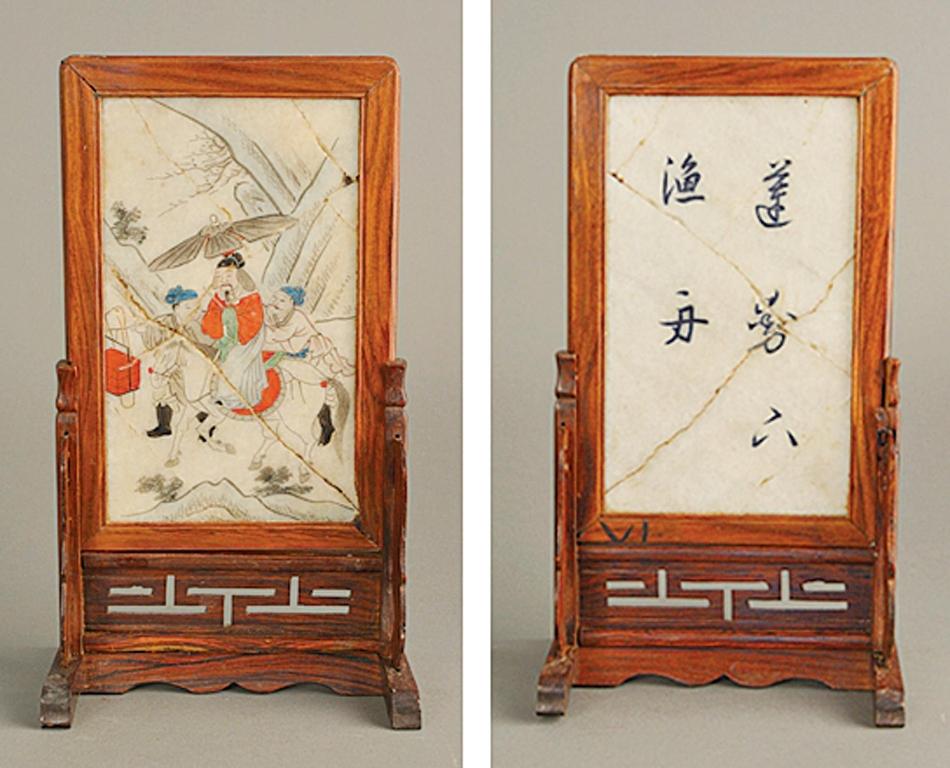 砚屏通常是用木头或竹子做成框架,镶嵌云母石、大理石一类带有纹理的美石,或者用石头、竹木的底板,在上面雕刻出人物、山水、花鸟、风景等传统题材图案,然后镶嵌在框架座内,便成为文房珍物。它与宋人的石癖自然密切相关,而追求绘画的水墨韵味也是形成这种欣赏趣向的原因之一。