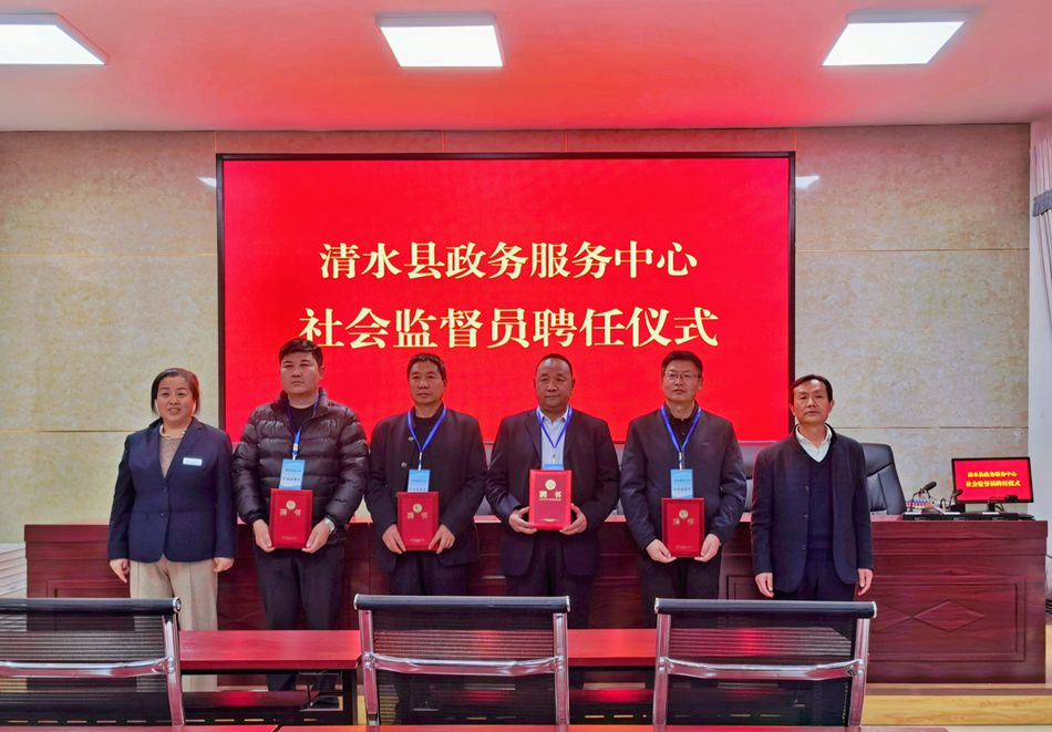 新天水讯 据清水县融媒体中心消息 为进一步发挥社会监督在政务服务工作中的重要作用,不断提升政务服务效能,持续优化营商环境,11月23日,清水县政务服务中心举行政务服务社会监督员聘任仪式,聘请政协委员、人大代表、群众代表等6名行业代表为清水县政务服务社会监督员,并为他们颁发了聘书。