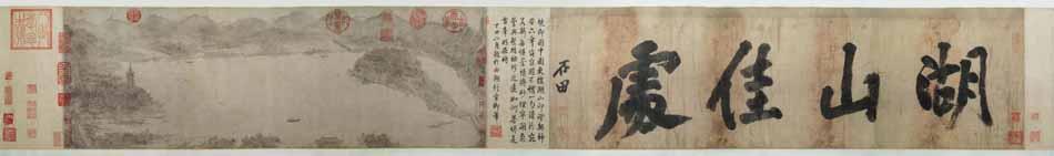 此外,《西湖图》引首有明代沈周题写的“湖山佳处”4字,前隔水处有乾隆“丁丑二月”(1757年)在“西湖行宫”的御笔题诗,钤“乾隆宸翰”“水月两潋明”等朱文印,画卷上部和骑缝处更有11方大小和形状不一的乾隆赏印和清宫内府藏印,包括“古稀天子”“乾隆御览之宝”“石渠宝笈”“石渠定孺”“太上皇帝”“中心止水静”“三希堂精鉴玺”等朱文印,“乾隆鉴赏”“宝笈重编”“寿”“宜子孙”等白文印。画卷上还钤有清末收藏家庞元济的“莱臣心赏”“虚斋鉴定”“庞莱臣珍赏印”“得修鑫主人珍藏图书”等多方藏印。