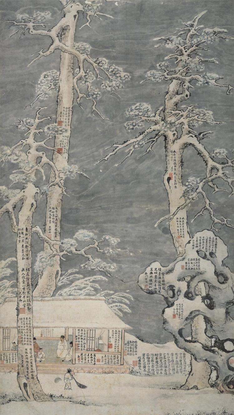 明·宋旭《雪居图》,纵135厘米,横76.4厘米,吉林省博物院藏。此图绘雪居园主人孙克弘(明代书画家、藏书家,字允执,号雪居)与好友雪后雅集的场景,是众多“别号图”中的上乘之作,也是一幅别具意趣的个性之作。纵观画史,绘写高士隐居之景的画作不胜枚举,但宋旭的《雪居图》集聚大量时贤跋文于画面中,非但没有破坏画面意境,反而将其变成了一件多人合作,逐渐完善的珍贵艺术品,使人看起来更加和谐统一,营造出了饶有趣味的视觉效果,令观者无不惊叹于其构图之新奇别致,可谓是文人画典型之作品,“别号图”中之翘楚。