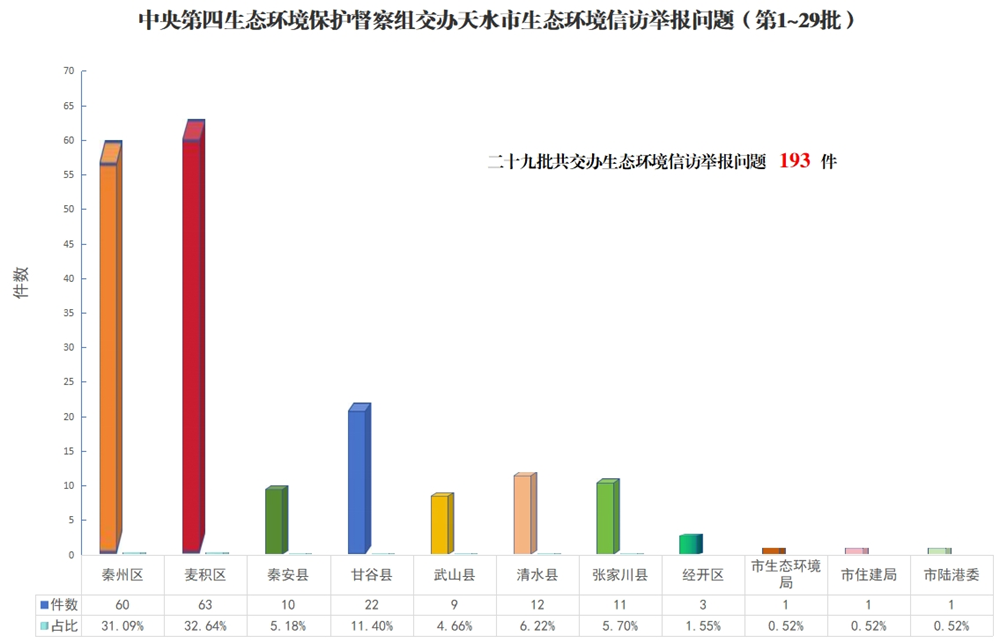 12月22日,中央第四生态环境保护督察组向我市交办了第二十九批群众举报件,共7件(其中来电5件,来信2件),其中秦州区2件、麦积区1件、甘谷县2件、清水县1件、经开区1件。群众举报反映问题涉及大气污染2件、水污染3件、土壤污染1件、生态破坏1件。