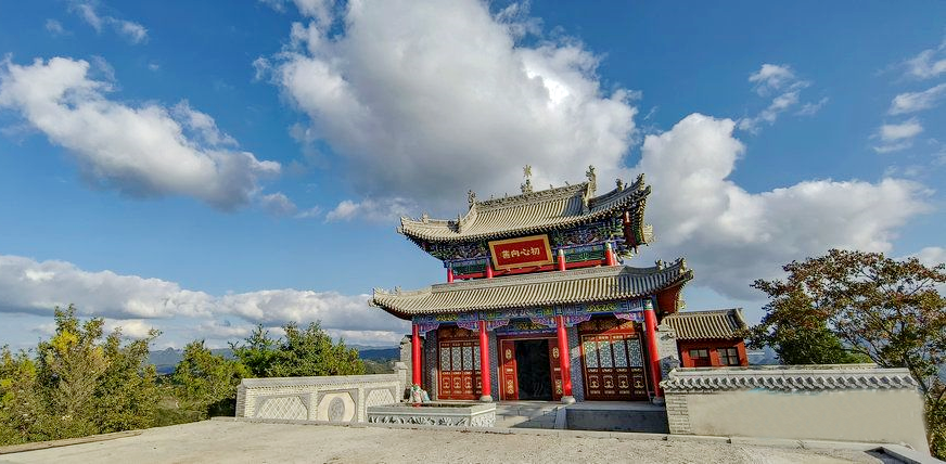 攀爬了一个小时,我们才来到神农山顶。山门白玉,苍穹湛蓝。在顶端,群山一一陈列眼前,犹如茫茫族人一般浩繁,形成一层层浪涛,由深而浅,延展到天际。神农山三面是悬崖,只有我们爬山的这一面可以登顶。山野中色彩斑驳,万物各展风韵,凝神眺望,不由人心思悠远。山上建筑不多,都是近年来新修的,虽面积不大,也设计精巧,显出殿宇建筑的雄伟气度。