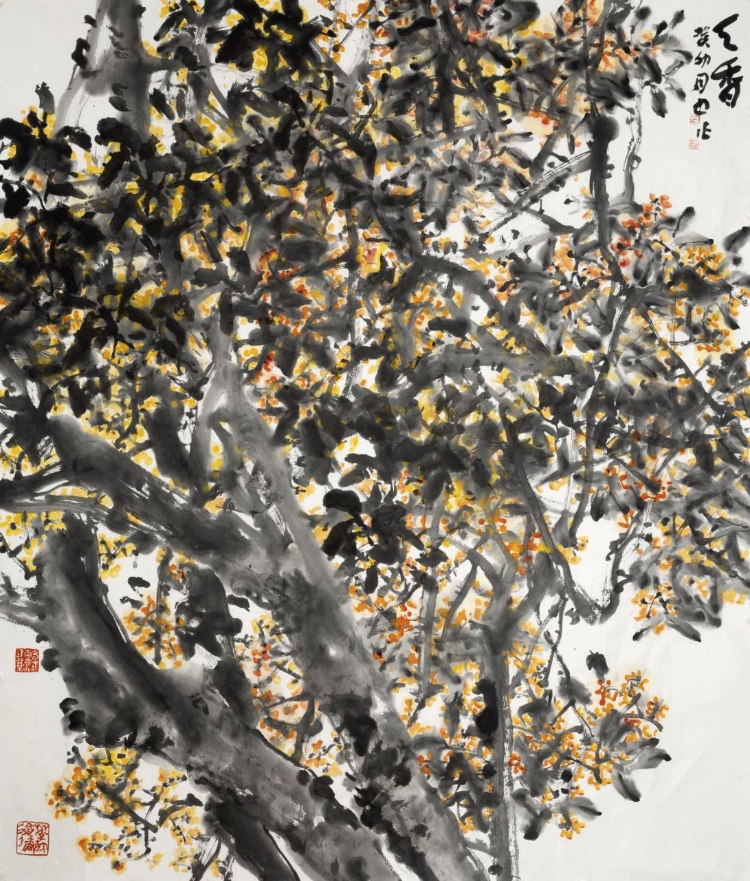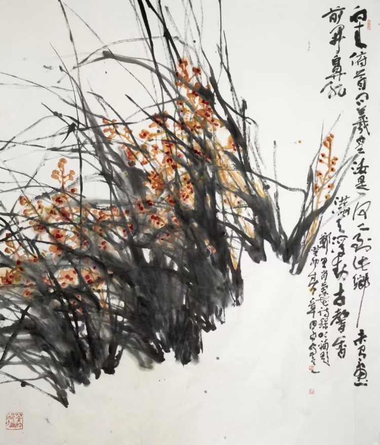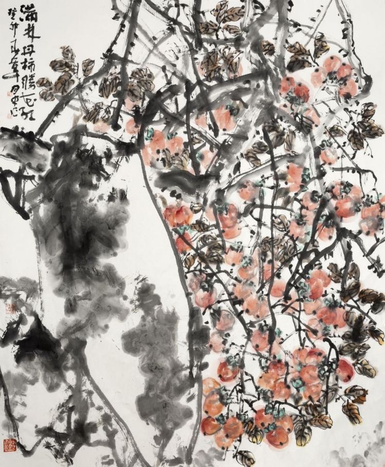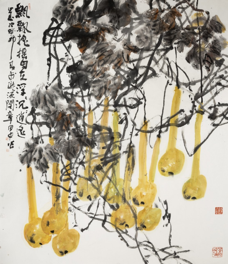 实际上,大写意花鸟画是写生记忆中的花鸟,是对生命感受到的花鸟的深情。如果说境界是写意花鸟画的灵魂,笔墨是性情的体现,那么寓兴的功能就体现在“有以兴起人之意者,率能夺造化而移精神”。来源于生活而高于生活,来自于客体而夺造化移精神。恽寿平在评画时曾说:“其意象在六合之表,荣落在四时之外。”这句话道出了花鸟画穿越时空追求精神境界的真谛。章月中的写意花鸟画重气局、重境界、重精神,有文化传统之血脉,有当代生活之底蕴,有洋为中用之取舍,托物言志,寓情于理,具有鼓舞人民朝气蓬勃迈向未来的崇高之美。他画的牡丹、紫藤、梅花、荷花、水仙花、向日葵、仙桃、柿子、石榴、葫芦、鱼、鸟等等,虽是小题材,却是大作品,形神兼备,意境深远,能让人们一看就动心,能让人们发现自然的美、生活的美、心灵的美,能让人们追求探索知、情、意、行相统一的中华美学精神。