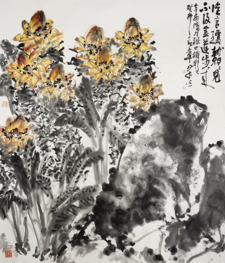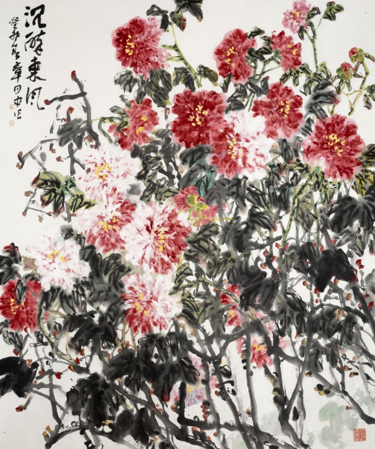 一是全景构图,气象一新。传统的花鸟画总体上说构图比较清逸,折枝的多,赏心只有两三枝,有时给人情调荒寒的感觉,如备受推崇的八大山人的作品,虽然经常引人沉思、给人感悟,但也经常让人感到孤高冷逸,有与世隔绝的味道,乃至于让观赏者沉浸在凄凉悲伤中(如孤鸟白眼单腿)。这样说,并不是说传统的构图不好,而是说时代不同了,不能只用传统的构图形式。时代在变,构图形式也在变。而章月中的花鸟画,构图形式在吸收传统的基础上呈现全景式、团块式。一眼看去上下左右四面八方丰盈饱满,花花草草成团成簇热烈奔放。花花草草在他的笔下,茁壮茂盛,生长的顶天立地,朝气蓬勃。远观赏心悦目,近看墨色淋漓,痛快!其状、其象、其色气象万千。一幅《沉醉东风》牡丹图,大气磅礴、色彩饱满、明艳照人,给人以生命怒放的感觉,把观赏者的精气神一下子就提了起来,令人心潮澎湃。
