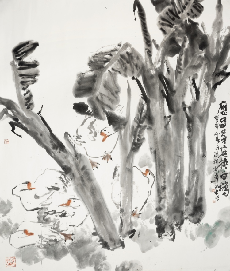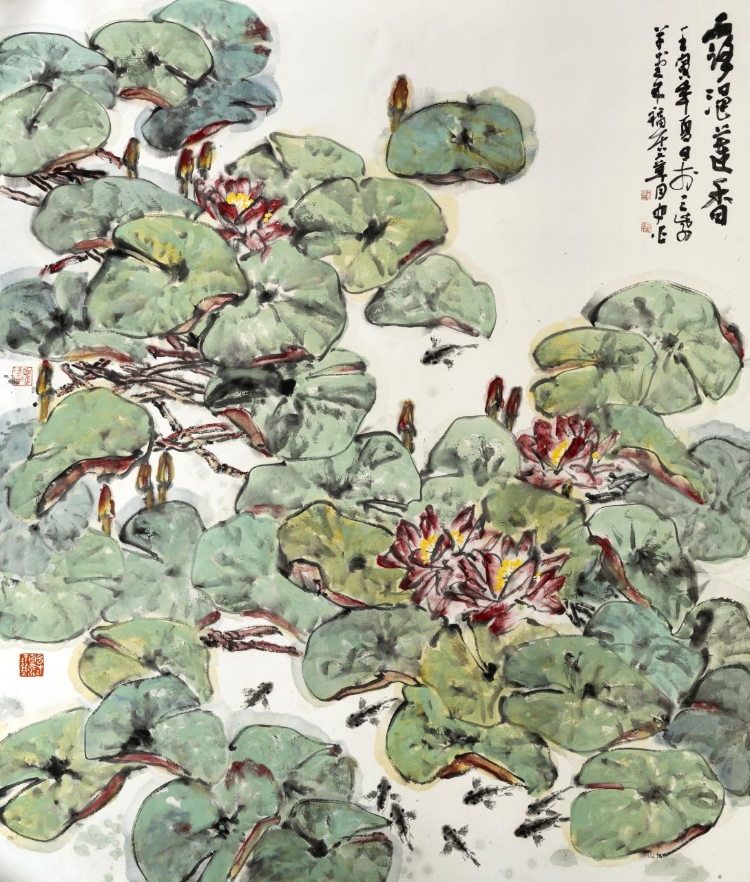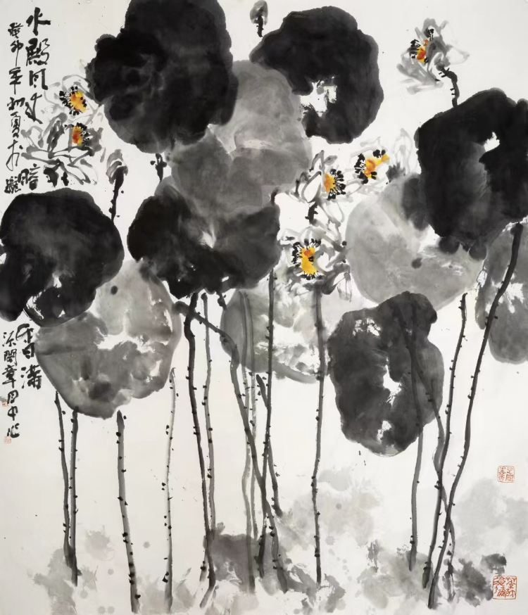 三是水色交融,浑然天成。1702年,石涛在一幅画上题跋:“一变于水,二运于墨,三受于蒙,水不变不醒,墨不运不透,醒透不蒙则素,此三胜也。”水、墨、蒙说透了水色蒙养的重要性。《沉醉东风》《紫藤挂云木》《田田翠叶红莲香》特别能体现他水色蒙养、用水用色的特点。赤橙黄绿青蓝紫,他持彩练当空舞。大胆用水,潇洒用色,点、烘、敷、抹,蒙养到位,浑然一体。其水氤氲饱满、浸染朦胧、剔透玲珑;其色鲜艳明丽、灿烂清新、丰富喜庆。水即是色,色即是水。古人说墨分五色,实际上他的画不止五色。因为水用得好,色就千变万化,创作的作品水色迷人,远看近观水色一天。红花墨叶成就了大师齐白石。燃烧的《向日葵》、金黄的《麦田》成为西方印象派大师梵·高的代表作。大胆借鉴齐白石、梵·高的用色,在色彩选择中注入主观感受,来营造出贴合自己心境的画面,成为章月中花鸟画的一大特点:水色淋漓、墨彩交辉。水色带给观赏者的愉悦,如春日里看到的鲜花、夏日里吹到的清风、秋日里摘到的硕果、冬日里晒到的暖阳,惬意、畅快,心生欢喜。