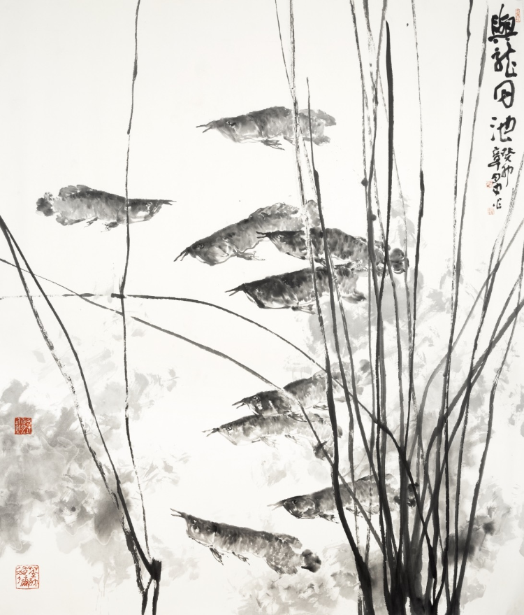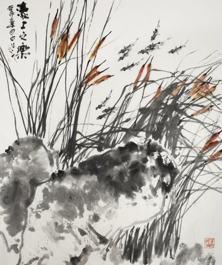绿水青山就是金山银山。在祖国大自然的怀抱中,牡丹、梅花、荷花、水仙、向日葵、杜鹃、紫鸢、水仙、柿树、石榴、葫芦、芦苇等等花卉、草木、鸟兽,都成为他观物的对象、考察的客体。特别是前人没有涉猎的题材,他也下功夫观察摹写,搜尽奇花打草稿,为百花写照,表现其情感,抒发其情怀。通过对物象、客体的考察和品读,感受大自然中蕴育的生命万有,生活中的乐观幸福。他的新作《乱山穷处亦花开》《濠上之乐》体现了他的真实感受、真实笔墨、真实感情、真实自然、真实学养。唯心在会,唯在妙语。天地有大美而不言。生活美好寓意心中,人文精神跃然纸上。