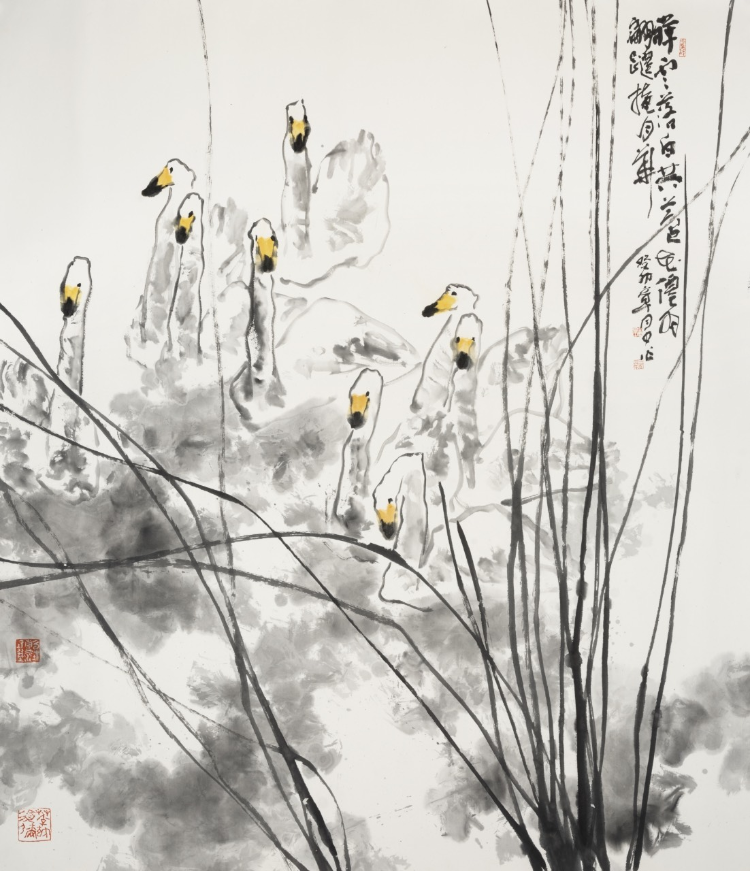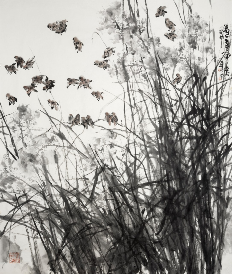 二是笔墨随心,心有灵犀。有人曾经说,笔墨等于零。实则不然。中国画几千年的历史恰好说明,笔墨乃中国画的核心,是中国画的DNA。历史上凡是名家名作,无不是笔精墨妙。笔墨乃性情之事,用笔和用墨是分不开的,笔法墨法心有灵犀一点通。章月中的笔感、墨感、笔性、墨性都很强。极好的笔感、墨感、笔性、墨性来自于他的兴趣、勤奋、学养、天赋。且看《春韵》《华顶杜鹃》《绰约新妆玉有辉》《乱山穷处亦花开》《田田翠叶红莲香》《芦花啼鸟》,笔法潇洒奔放,浓淡干湿焦五色丰富,浑厚华滋,刚柔相济,自然流畅,笔断意连,有味道,有气韵,形式和内涵完美融合在了一起,用石涛的话说就是“用情笔墨之中,放怀笔墨之外”。笔墨的至高境界在于思想和灵魂的体现。“有境界则自成高格”,王国维说得真对。古代许多大家的作品之所以能够吸引人们的目光、攫取人们的灵魂,主要原因在于他们的笔墨所体现的美学之道、哲学思想。研读分析感受欣赏章月中的笔墨,让我想起了《中庸》里面的金句“致广大而尽精微,极高明而道中庸”,“天地之道:博也,厚也,高也,明也,悠也,久也”。
