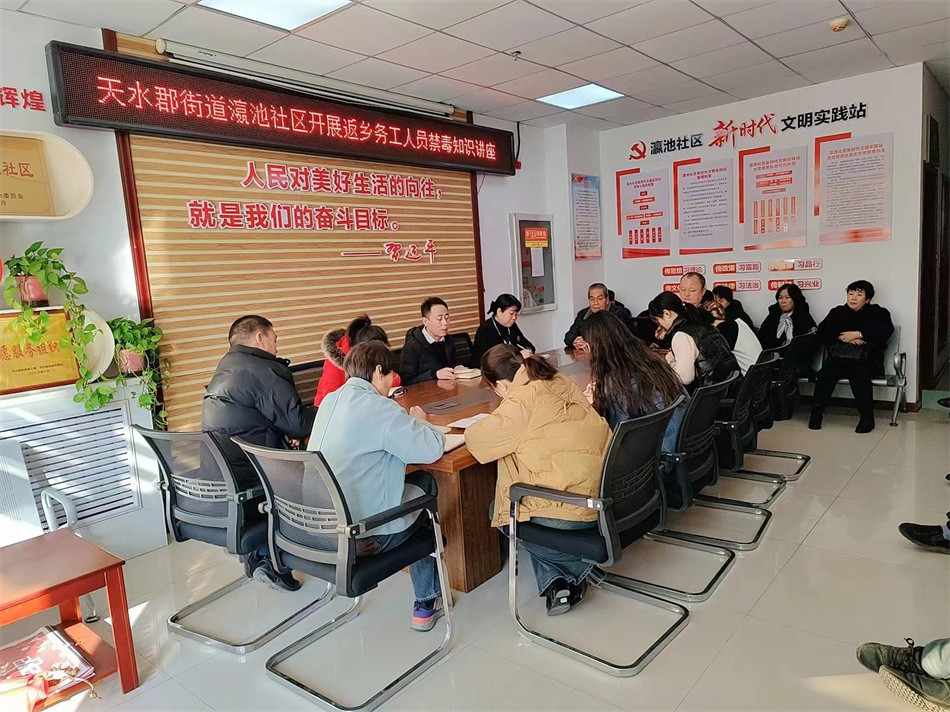 新天水讯 据秦州区融媒体中心消息 近日,天水郡街道瀛池社区组织干部、网格员、志愿者开展了务工返乡人员禁毒知识讲座。