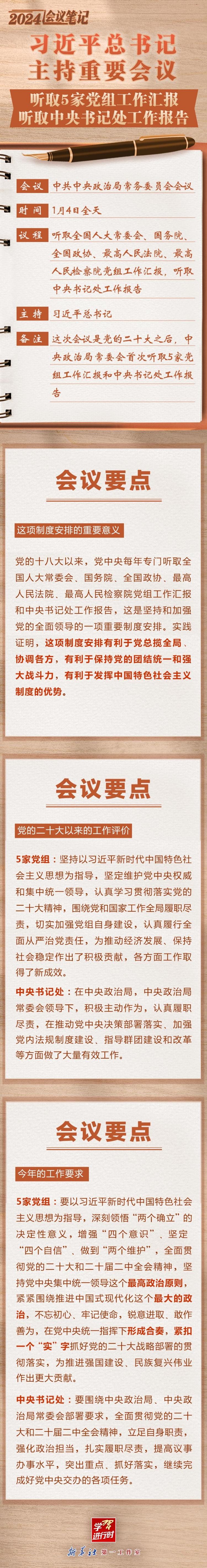 学习进行时|2024会议笔记:习近平总书记主持重要会议 听取5家党组工作汇报 听取中央书记处工作报告