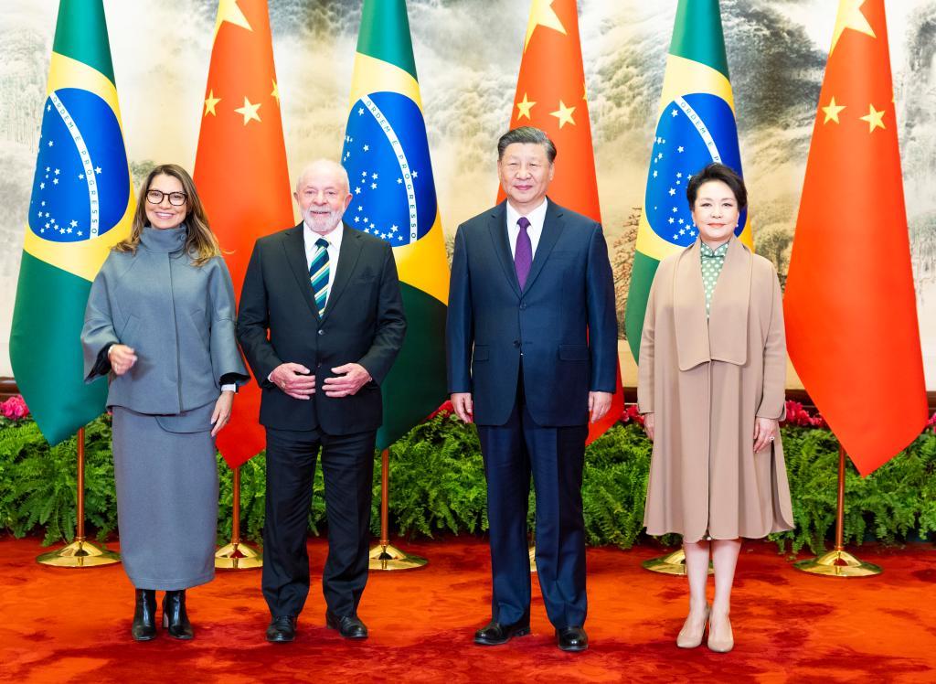 2023年4月14日下午,国家主席习近平在北京人民大会堂同来华进行国事访问的巴西总统卢拉举行会谈。这是会谈前,习近平和夫人彭丽媛同卢拉和夫人罗桑热拉合影。