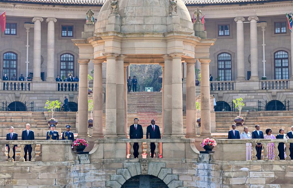 当地时间2023年8月22日上午,正在南非进行国事访问的国家主席习近平在比勒陀利亚总统府同南非总统拉马福萨会谈。会谈前,拉马福萨在总统府广场为习近平举行欢迎仪式。