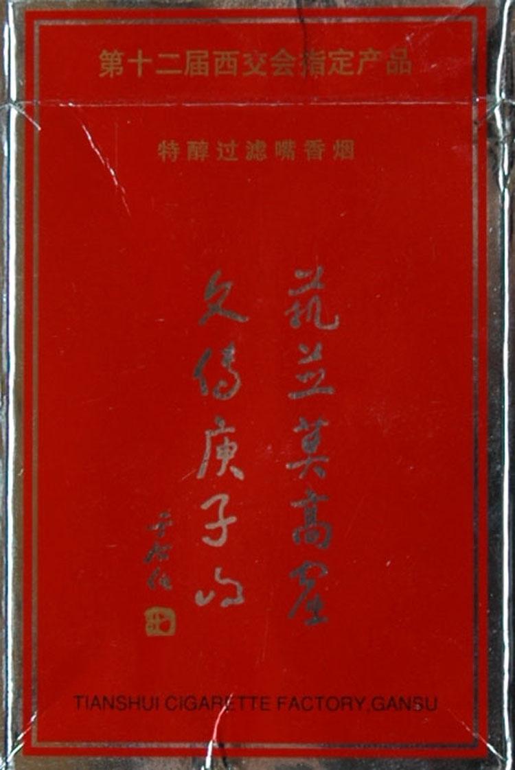 “第十二届中国西部商品交易会暨2000年天水伏羲文化旅游节”举办期间,为配合盛会召开,曾出品有一枚“麦积山”烟标,该标为加字标,在烟标的上部有“第十二届西交会指定产品”字样。该标主题颜色为鲜红色,烟标的主标绘有麦积山的轮廓,虽是简简几笔,但麦垛形的麦积山跃然纸上。更为奇特的还是烟标的副标为一副对联,仔细一看原来是书法大师于右任的墨迹,为“艺并莫高窟;文传庾子山”落款为“于右任”。原来,这就是于右任为麦积山题写的一副著名的对联。