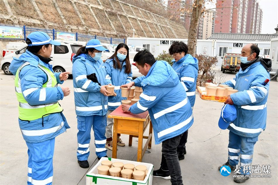 新天水讯 据麦积区融媒体中心消息 浓情腊八节,情暖环卫工。1月18日腊八节当天,民进麦积区委员会联合麦积区环卫中心开展“一碗腊八粥 温暖一座城”爱心公益活动,为一线环卫工人送去了热气腾腾的腊八粥及节日的问候,传承传统节日文化内涵,弘扬中华传统美德。