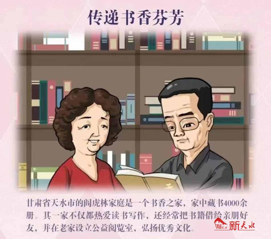 大爱无言,润物无声,阎虎林对书籍、对文化的喜爱,也在无形中延续到了伴侣及子孙的身上。妻子对他抱回家的一摞摞书籍从无阻拦和埋怨,而是将其整理得井井有条,有时还会帮他在电脑前敲敲稿子。女儿闫璐自小喜欢文学,上大学时写的文章就被收入《生活琐忆》一书,毕业后,她在天水广播电视台工作期间,采写了许多重要新闻稿件,并获得多项国家省市级奖项。儿子闫河亦爱写作和书画,常在本地报刊发表文章和美术作品,也曾在多个作文、美术类比赛上崭露头角。然而,最让他欣喜的是,他的小孙子们也都爱读书,且有些爱不释手。