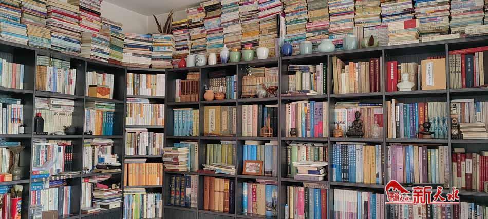 走入阎虎林的书房,映入眼帘的是从地板延伸到天花板的近两面书墙。书架上摆放着不同时代、不同领域的各种书籍,有几层还点缀着几只精致可爱的小摆件和陶罐。因为书太多的缘故,卧室的窗台两侧也整齐码着几摞书,且这书还大有侵占他私人区域之势,靠近床的一侧,已由窗台蔓延至床头柜。就连床上也没幸免,一本倒扣着的《宋史》,似是在向对面书架上的同伴发着邀约……