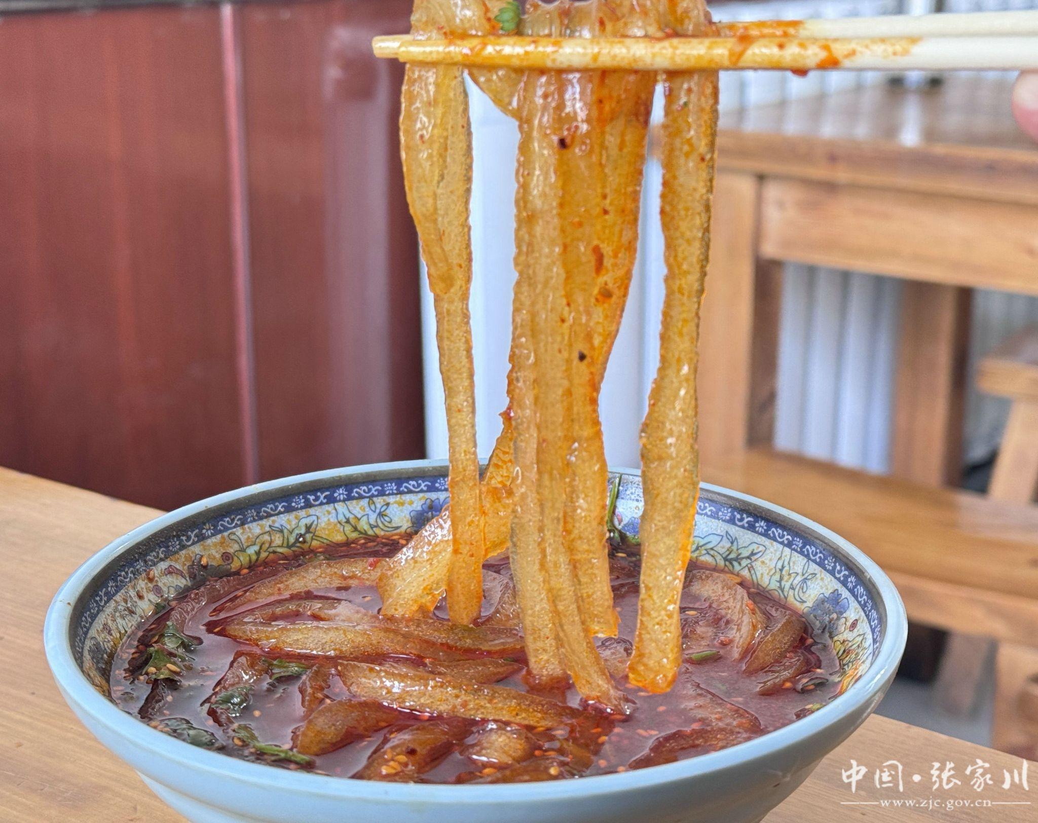 在张家川的麻辣烫店里,你选好菜、挑好粉后,老板将提前泡软的粉条放进沸腾的锅里,它们在汤汁里翻滚几分钟后就可以出锅了,出锅后浇上炸好的辣椒油、撒一点花椒粉、放上花生米和香菜,于是粉条的润滑、花椒的麻、花生的脆、辣椒的香味……夹在一起下肚后,鲜香与麻辣交织在一起,形成了一种无法言表的美妙滋味。